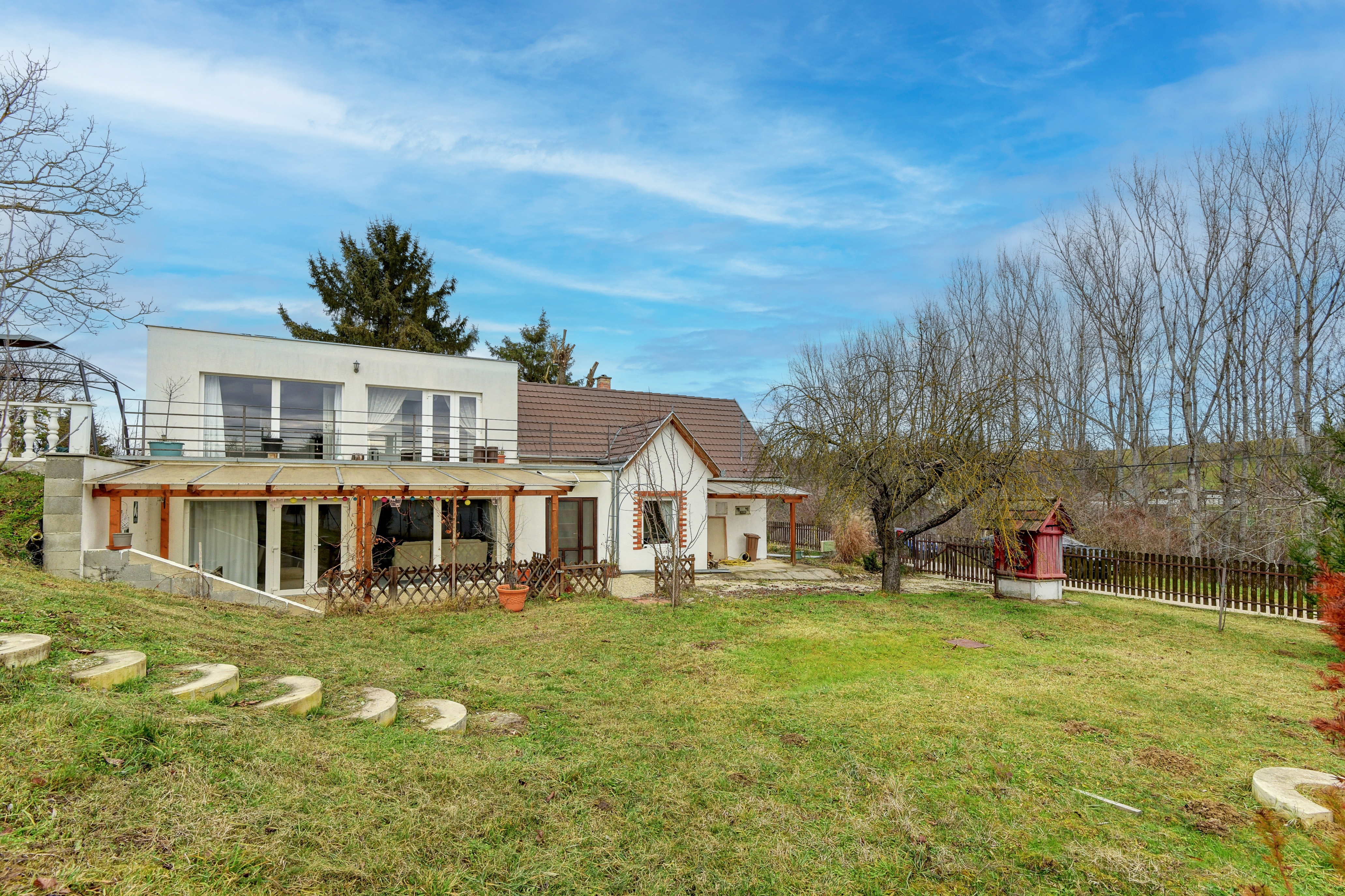 A tágas, lépcsőzetes, gyümölcsfákkal is beültetett kert (1838 m²) kiváló lehetőséget biztosít pihenésre vagy éppen kertészkedésre. A három terasz pedig kikapcsolódást nyújt minden évszakban, legyen szó akár grillezésről, wellnessről vagy a hullócsillagokra várakozásról.